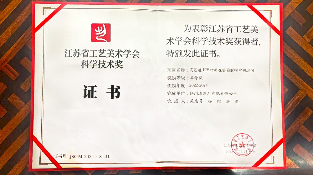 近日,江苏省工艺美术学会正式公布2022-2024年度科学技术奖获奖名单,扬州漆器厂有限责任公司高密度EPS材料脱模技术荣获三等奖,为扬州漆器这一国家级非物质文化遗产的现代化发展再添新誉。