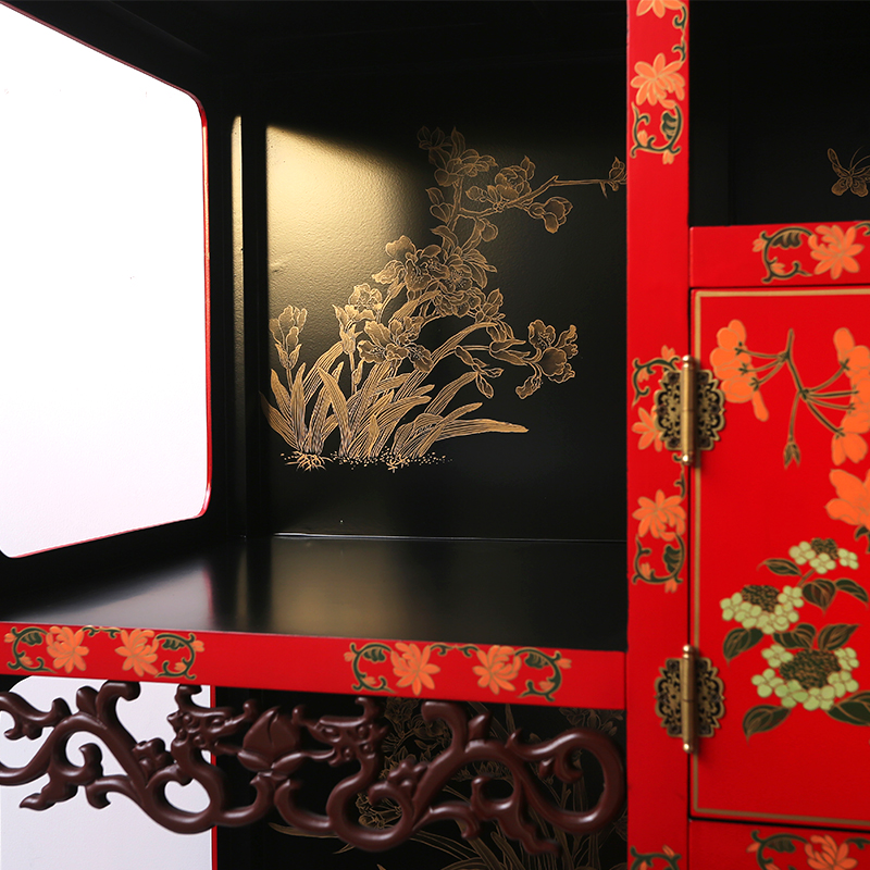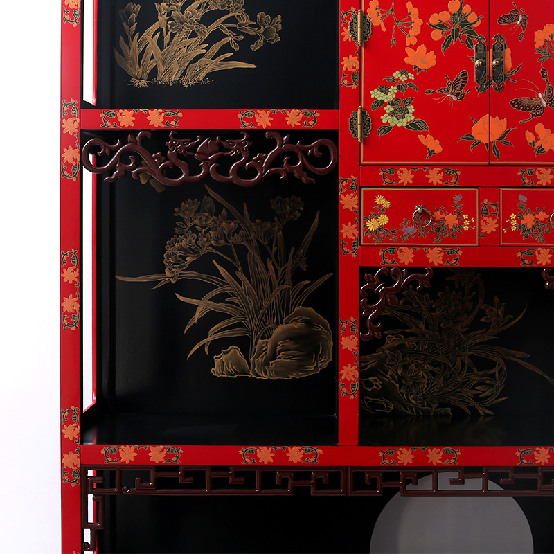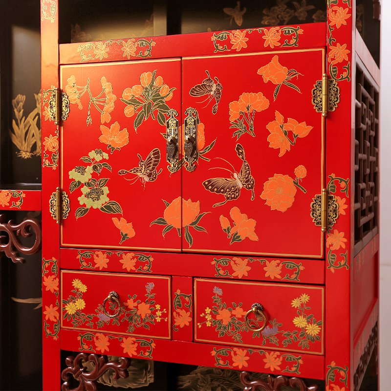 名称:彩绘描金红底博古架