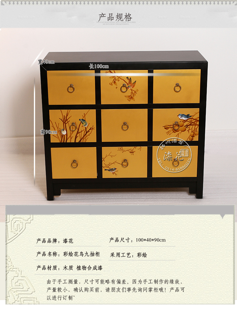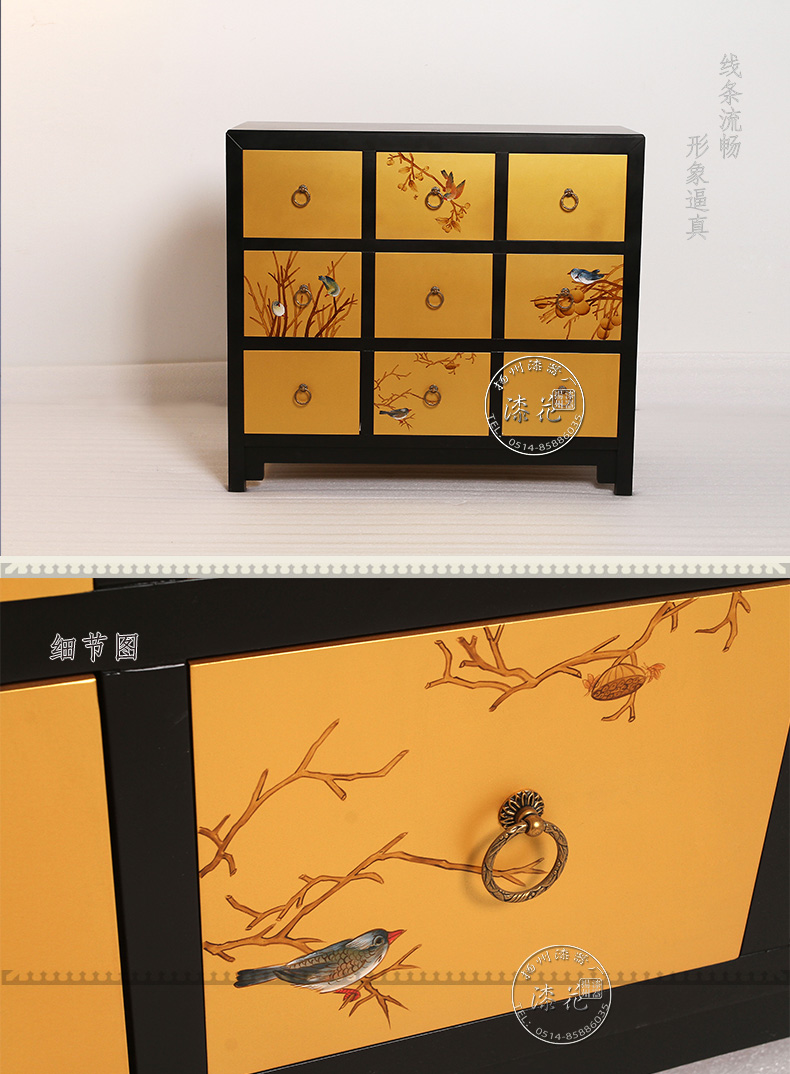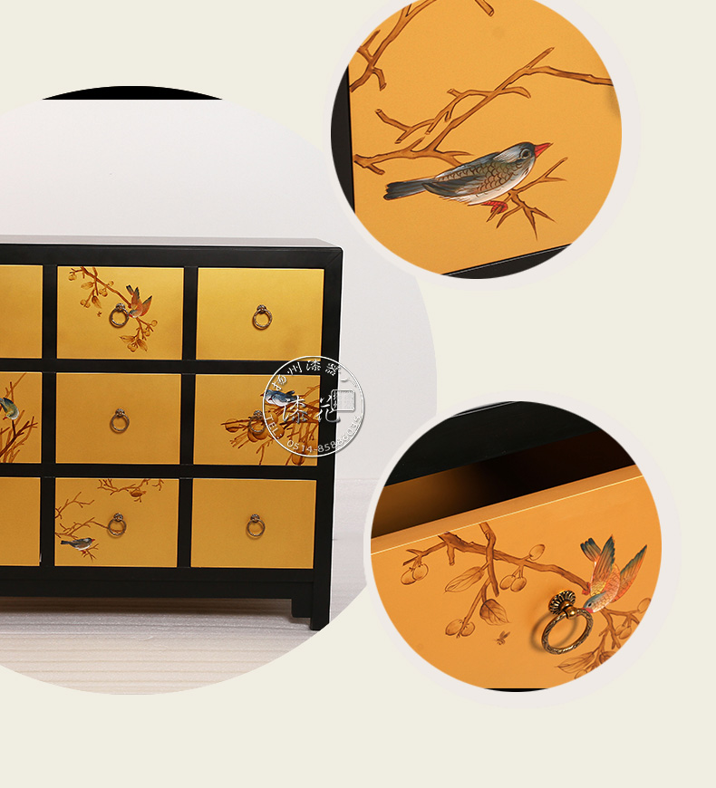 名称:彩绘喷金花鸟九抽柜