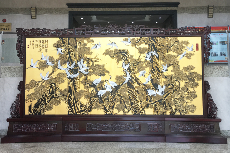 《汉柏颂千秋》地屏,其画面根据苏州名胜两千年前古汉代“青、奇、古、怪”柏树而创作,采用了扬州传统的著名刻漆装饰手法,由江苏省工艺美术名人、高级工艺美术师吕永林设计,二十多名高级技师历经三个多月精心制作而成。